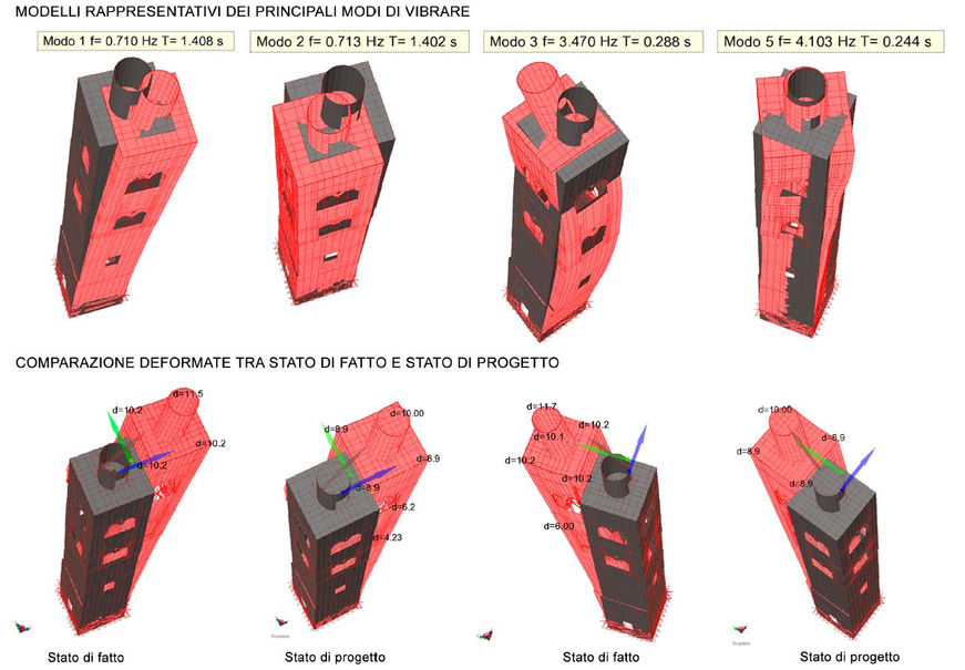 Tale risultato è legato alla tipologia strutturale del campanile. Esso infatti è caratterizzato da una massa elevata ed un’altezza considerevole, soprattutto se rapportata alle dimensioni in pianta della struttura. Il campanile infatti presenta una pianta pressoché quadrata di dimensioni esterne, alla base, pari a circa 5,40 m x 5,40 m ed ha un’altezza complessiva di circa 35 m, oltre alla croce metallica posta sulla sommità del tamburo.