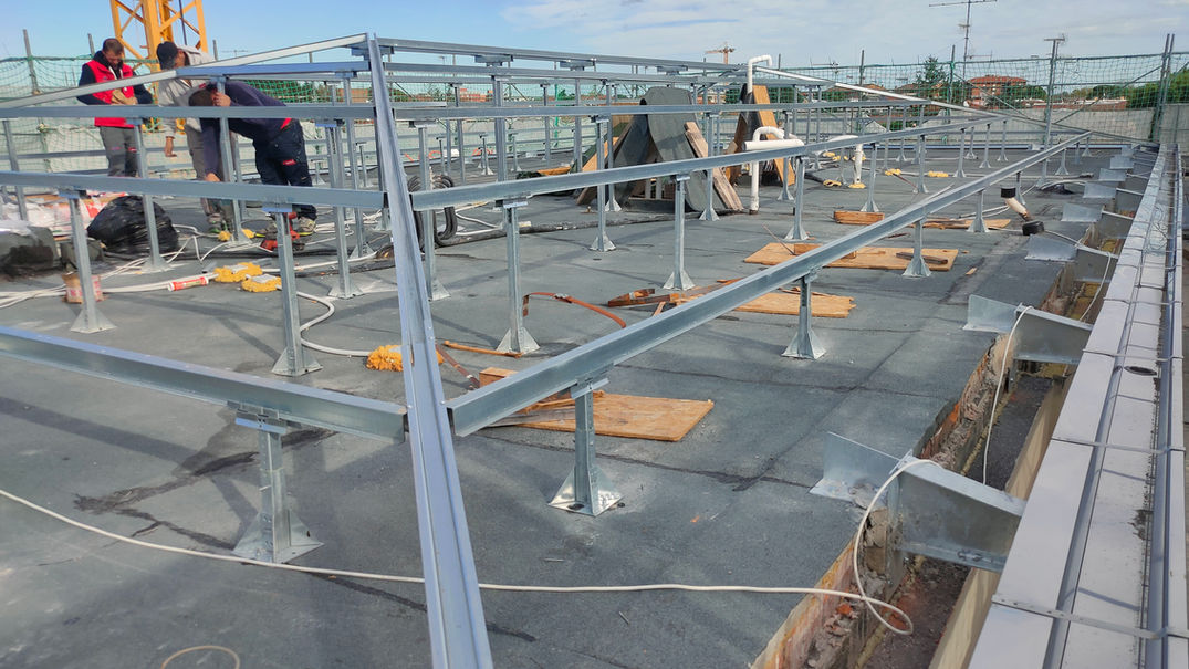 - Rifacimento della copertura mediante demolizione della struttura esistente in laterocemento e installazione di nuova copertura metallica su piedini;